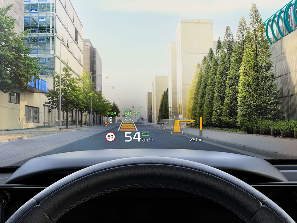 Mit dem größeren 25,4 cm (10 Zoll) Head-up-Display behältst du die Straße immer im Blick. Es projiziert die wichtigsten Fahrinformationen dezent auf die Windschutzscheibe, direkt in deine Sichtlinie hinein.⁵